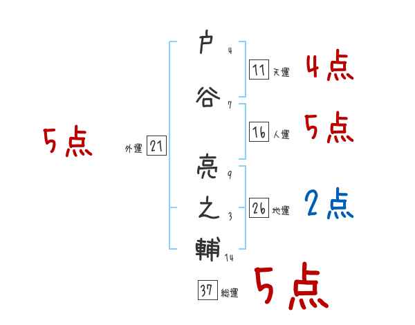 外運![]() | 戸谷亮之輔さんの外運は21画の5つ星!統率力がある。独立し成功する。名誉を手に入れる。 生活面を象徴する運勢です。外部から受ける影響力を表し、結婚運、家庭運や職場、環境への順応性を表します。 |