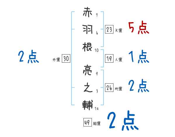 天運![]() | 赤羽根亮之輔さんの天運は23画の5つ星!想像力に優れ活力がある。一代で成功し名誉を手に入れる。 家系が持つ宿命的な運勢を表します。祖先から受け継いだ苗字ですので自分の力が及びません。家柄を象徴します。 |