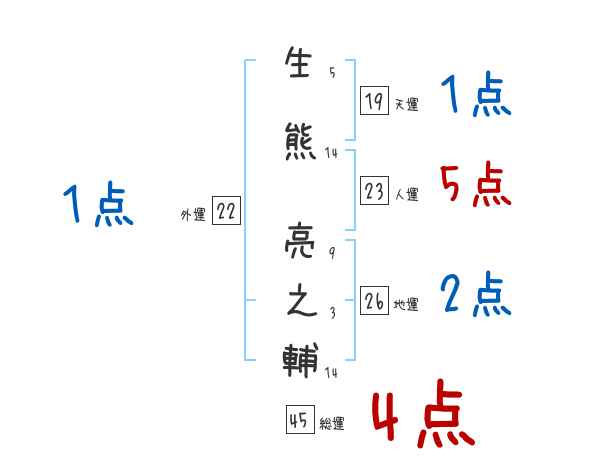 外運![]() | 生熊亮之輔さんの外運は22画の1つ星!努力することが苦手ないっぽう手先が器用。芸術性にも優れる。 生活面を象徴する運勢です。外部から受ける影響力を表し、結婚運、家庭運や職場、環境への順応性を表します。 |