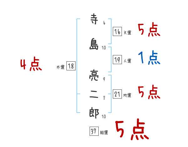 天運![]() | 寺島亮二郎さんの天運は16画の5つ星!人望が厚く大きく発展する。逆転成功が見える。 家系が持つ宿命的な運勢を表します。祖先から受け継いだ苗字ですので自分の力が及びません。家柄を象徴します。 |