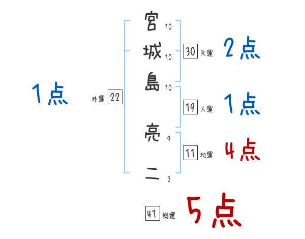 天運![]() | 宮城島亮二さんの天運は30画の2つ星!浮き沈みの激しさに注意しましょう。 家系が持つ宿命的な運勢を表します。祖先から受け継いだ苗字ですので自分の力が及びません。家柄を象徴します。 |
