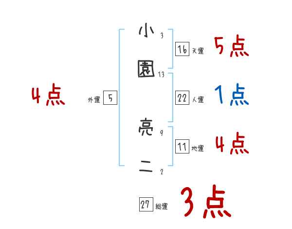 外運![]() | 小園亮二さんの外運は5画の4つ星!健康で安泰。協調性に優れ、財産に恵まれる。 生活面を象徴する運勢です。外部から受ける影響力を表し、結婚運、家庭運や職場、環境への順応性を表します。 |