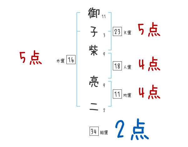 外運![]() | 御子柴亮二さんの外運は16画の5つ星!人望が厚く大きく発展する。逆転成功が見える。 生活面を象徴する運勢です。外部から受ける影響力を表し、結婚運、家庭運や職場、環境への順応性を表します。 |