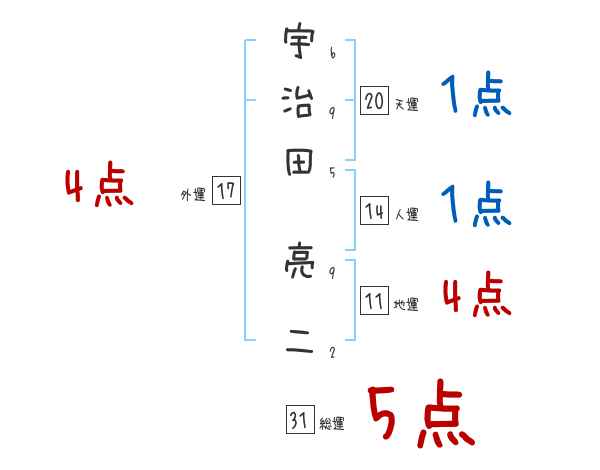 外運![]() | 宇治田亮二さんの外運は17画の4つ星!積極的な行動力。地位を気づき財産を手に入れる。純粋な心と直感力。 生活面を象徴する運勢です。外部から受ける影響力を表し、結婚運、家庭運や職場、環境への順応性を表します。 |