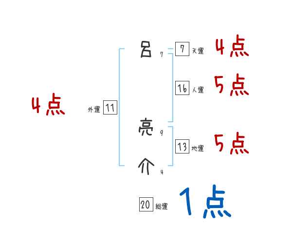 天運![]() | 呂亮介さんの天運は7画の4つ星!強い意志や信念を持ち独立心が強い。自立する。 家系が持つ宿命的な運勢を表します。祖先から受け継いだ苗字ですので自分の力が及びません。家柄を象徴します。 |