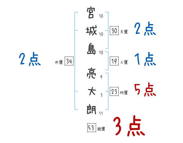 総運![]() | 宮城島亮大朗さんの総運は53画の3つ星!やや見栄っ張りで虚栄心がある。散財に注意。 あなたの人生を表す1番重要な運勢です。生涯を通じて影響する総合運となり、主に50歳以降の晩年期に影響を及ぼします。 |