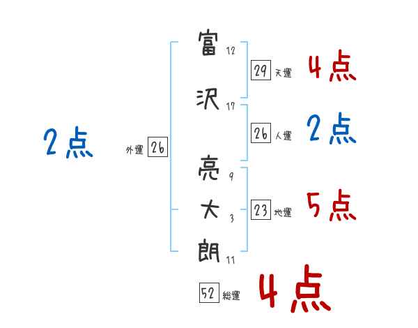 外運![]() | 富沢亮大朗さんの外運は26画の2つ星!波瀾万丈かも。信頼できる人を大事にしましょう。 生活面を象徴する運勢です。外部から受ける影響力を表し、結婚運、家庭運や職場、環境への順応性を表します。 |