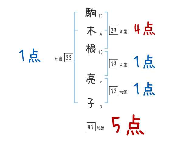 外運![]() | 駒木根亮子さんの外運は22画の1つ星!努力することが苦手ないっぽう手先が器用。芸術性にも優れる。 生活面を象徴する運勢です。外部から受ける影響力を表し、結婚運、家庭運や職場、環境への順応性を表します。 |