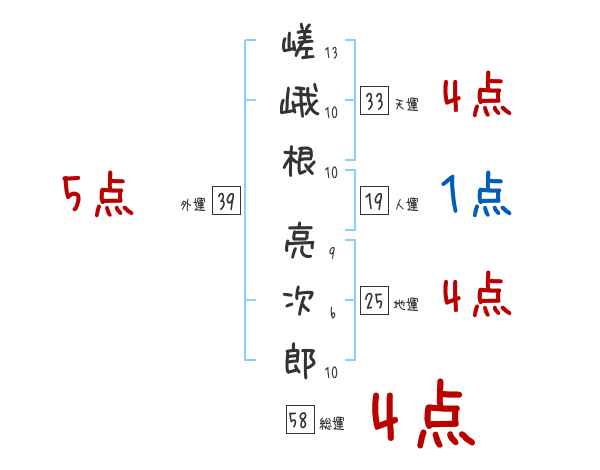 総運![]() | 嵯峨根亮次郎さんの総運は58画の4つ星!安定した生活。大器晩成タイプ。 あなたの人生を表す1番重要な運勢です。生涯を通じて影響する総合運となり、主に50歳以降の晩年期に影響を及ぼします。 |