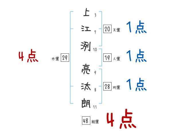 外運![]() | 上江洌亮汰朗さんの外運は29画の4つ星!完全主義で才能がある。厳格な心の持ち主。 生活面を象徴する運勢です。外部から受ける影響力を表し、結婚運、家庭運や職場、環境への順応性を表します。 |