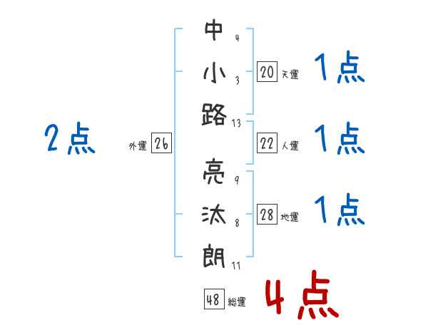 外運![]() | 中小路亮汰朗さんの外運は26画の2つ星!波瀾万丈かも。信頼できる人を大事にしましょう。 生活面を象徴する運勢です。外部から受ける影響力を表し、結婚運、家庭運や職場、環境への順応性を表します。 |