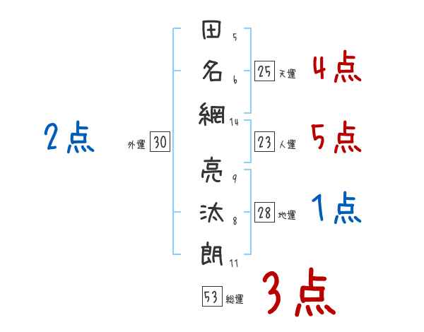 人運![]() | 田名網亮汰朗さんの人運は23画の5つ星!想像力に優れ活力がある。一代で成功し名誉を手に入れる。 性格や才能などを表す2番目に重要な運勢です。人間関係や協調性、社会的な成功に影響します。主に20歳から50歳ぐらいまでの中年期の運勢を表します。 |