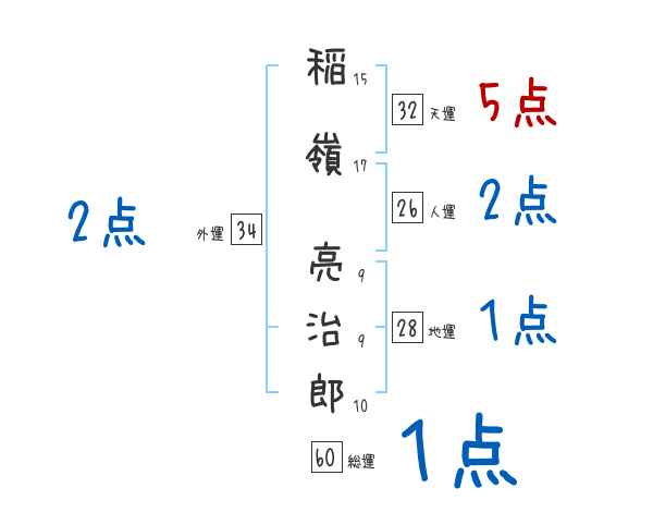 天運![]() | 稲嶺亮治郎さんの天運は32画の5つ星!柔軟性があり成功する。チャンスが多く金運が良い。 家系が持つ宿命的な運勢を表します。祖先から受け継いだ苗字ですので自分の力が及びません。家柄を象徴します。 |