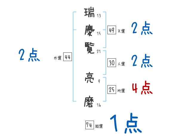 外運![]() | 瑞慶覧亮磨さんの外運は44画の2つ星!誠実で慎重な性格。物事を考えすぎないように注意しましょう。 生活面を象徴する運勢です。外部から受ける影響力を表し、結婚運、家庭運や職場、環境への順応性を表します。 |