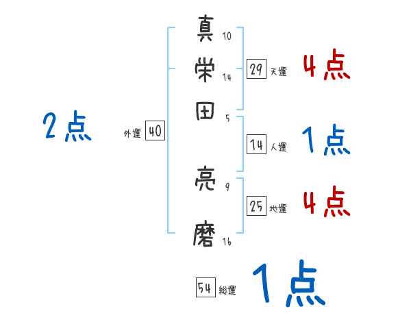 天運![]() | 真栄田亮磨さんの天運は29画の4つ星!完全主義で才能がある。厳格な心の持ち主。 家系が持つ宿命的な運勢を表します。祖先から受け継いだ苗字ですので自分の力が及びません。家柄を象徴します。 |
