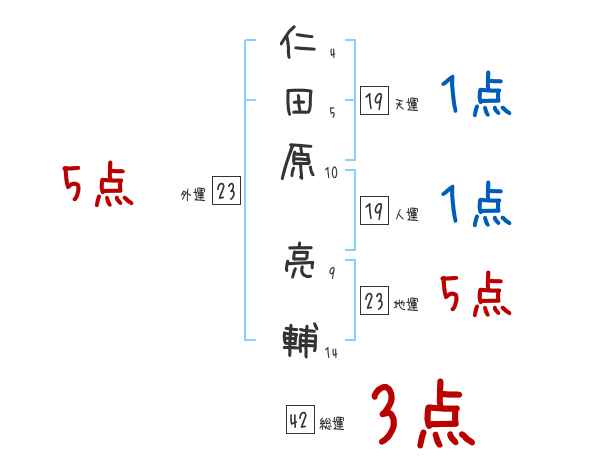 人運![]() | 仁田原亮輔さんの人運は19画の1つ星!優れた才能を持ちますが、協調性が足りないことも。周りの人と協力する事を意識しましょう。 性格や才能などを表す2番目に重要な運勢です。人間関係や協調性、社会的な成功に影響します。主に20歳から50歳ぐらいまでの中年期の運勢を表します。 |