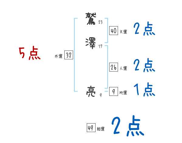 外運![]() | 鷲澤亮さんの外運は32画の5つ星!柔軟性があり成功する。チャンスが多く金運が良い。 生活面を象徴する運勢です。外部から受ける影響力を表し、結婚運、家庭運や職場、環境への順応性を表します。 |