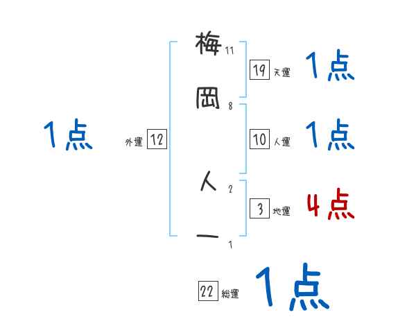 梅岡人一さんの総運は22画の1つ星