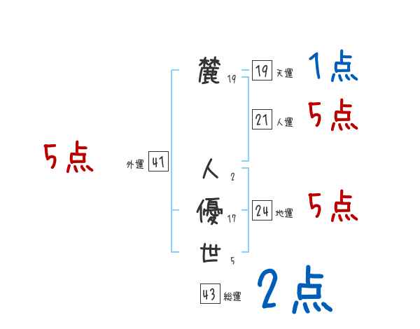 人運![]() | 麓人優世さんの人運は21画の5つ星!統率力がある。独立し成功する。名誉を手に入れる。 性格や才能などを表す2番目に重要な運勢です。人間関係や協調性、社会的な成功に影響します。主に20歳から50歳ぐらいまでの中年期の運勢を表します。 |