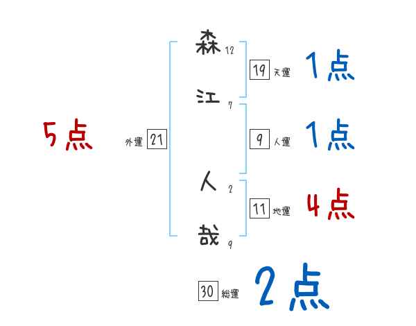外運![]() | 森江人哉さんの外運は21画の5つ星!統率力がある。独立し成功する。名誉を手に入れる。 生活面を象徴する運勢です。外部から受ける影響力を表し、結婚運、家庭運や職場、環境への順応性を表します。 |
