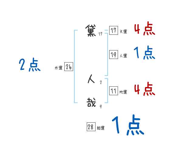人運![]() | 黛人哉さんの人運は19画の1つ星!優れた才能を持ちますが、協調性が足りないことも。周りの人と協力する事を意識しましょう。 性格や才能などを表す2番目に重要な運勢です。人間関係や協調性、社会的な成功に影響します。主に20歳から50歳ぐらいまでの中年期の運勢を表します。 |