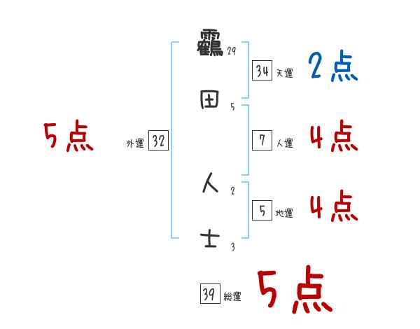 総運![]() | 靏田人士さんの総運は39画の5つ星!社交性に優れ人望が厚い。人の上に立ち成功する。 あなたの人生を表す1番重要な運勢です。生涯を通じて影響する総合運となり、主に50歳以降の晩年期に影響を及ぼします。 |