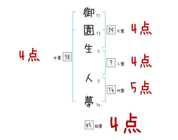 総運![]() | 御園生人夢さんの総運は45画の4つ星!もくもくと物事を進め達成する。地味な努力家。 あなたの人生を表す1番重要な運勢です。生涯を通じて影響する総合運となり、主に50歳以降の晩年期に影響を及ぼします。 |