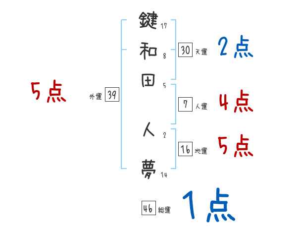 外運![]() | 鍵和田人夢さんの外運は39画の5つ星!社交性に優れ人望が厚い。人の上に立ち成功する。 生活面を象徴する運勢です。外部から受ける影響力を表し、結婚運、家庭運や職場、環境への順応性を表します。 |
