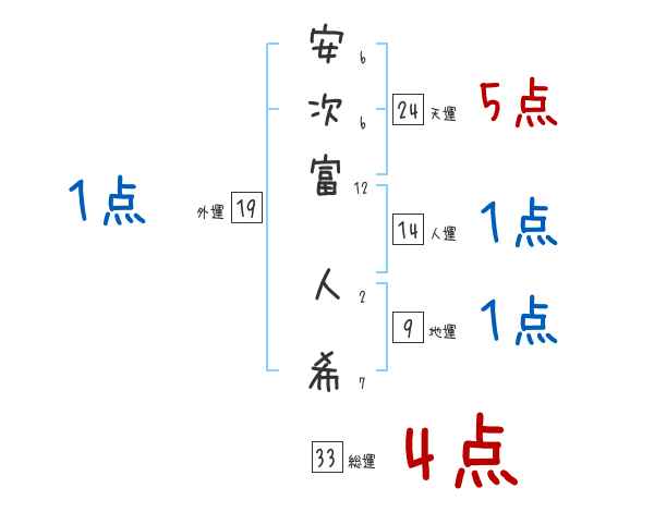 天運![]() | 安次富人希さんの天運は24画の5つ星!家庭運が良く順調な人生。金運にも恵まれる。 家系が持つ宿命的な運勢を表します。祖先から受け継いだ苗字ですので自分の力が及びません。家柄を象徴します。 |