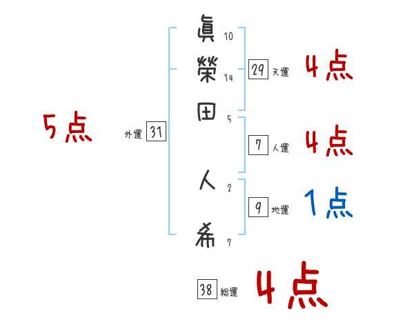 天運![]() | 眞榮田人希さんの天運は29画の4つ星!完全主義で才能がある。厳格な心の持ち主。 家系が持つ宿命的な運勢を表します。祖先から受け継いだ苗字ですので自分の力が及びません。家柄を象徴します。 |
