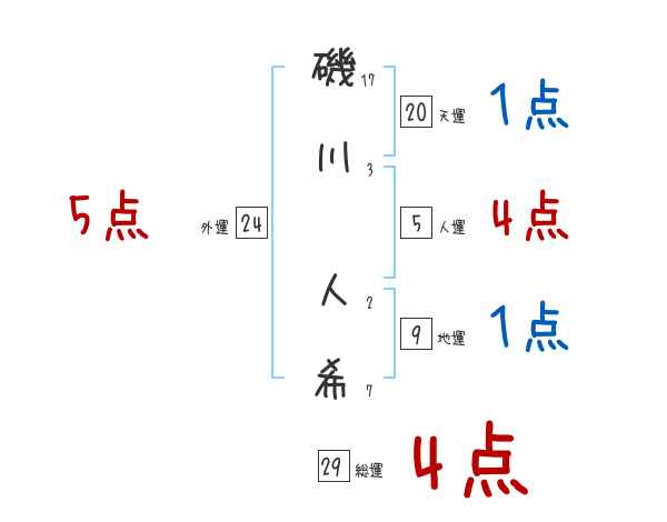 外運![]() | 磯川人希さんの外運は24画の5つ星!家庭運が良く順調な人生。金運にも恵まれる。 生活面を象徴する運勢です。外部から受ける影響力を表し、結婚運、家庭運や職場、環境への順応性を表します。 |
