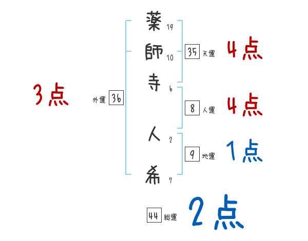 総運![]() | 薬師寺人希さんの総運は44画の2つ星!誠実で慎重な性格。物事を考えすぎないように注意しましょう。 あなたの人生を表す1番重要な運勢です。生涯を通じて影響する総合運となり、主に50歳以降の晩年期に影響を及ぼします。 |