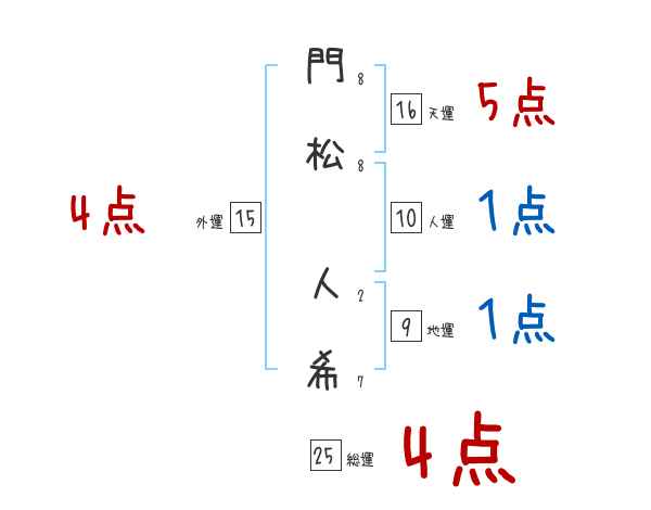 天運![]() | 門松人希さんの天運は16画の5つ星!人望が厚く大きく発展する。逆転成功が見える。 家系が持つ宿命的な運勢を表します。祖先から受け継いだ苗字ですので自分の力が及びません。家柄を象徴します。 |