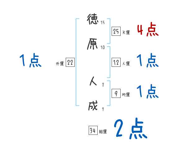 総運![]() | 徳原人成さんの総運は34画の2つ星!独創性に優れるが、自尊心が強く災難に注意しましょう。 あなたの人生を表す1番重要な運勢です。生涯を通じて影響する総合運となり、主に50歳以降の晩年期に影響を及ぼします。 |