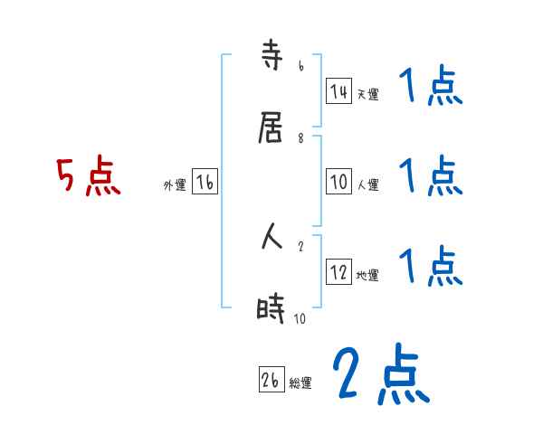 外運![]() | 寺居人時さんの外運は16画の5つ星!人望が厚く大きく発展する。逆転成功が見える。 生活面を象徴する運勢です。外部から受ける影響力を表し、結婚運、家庭運や職場、環境への順応性を表します。 |