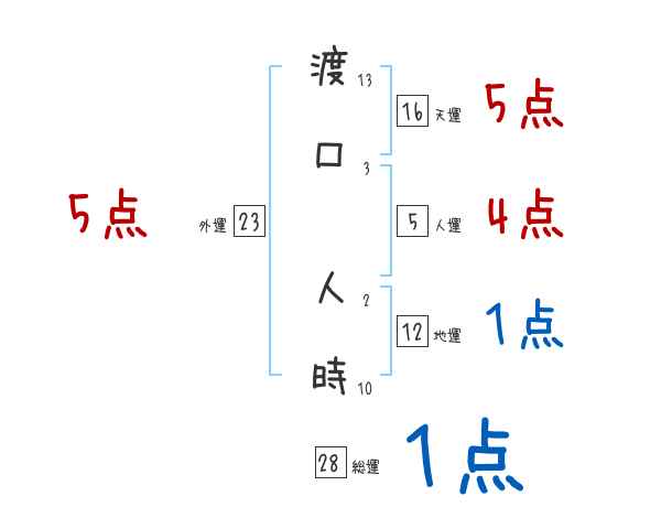 総運![]() | 渡口人時さんの総運は28画の1つ星!家庭環境に注意。スポーツで活躍できる能力があるかも。 あなたの人生を表す1番重要な運勢です。生涯を通じて影響する総合運となり、主に50歳以降の晩年期に影響を及ぼします。 |