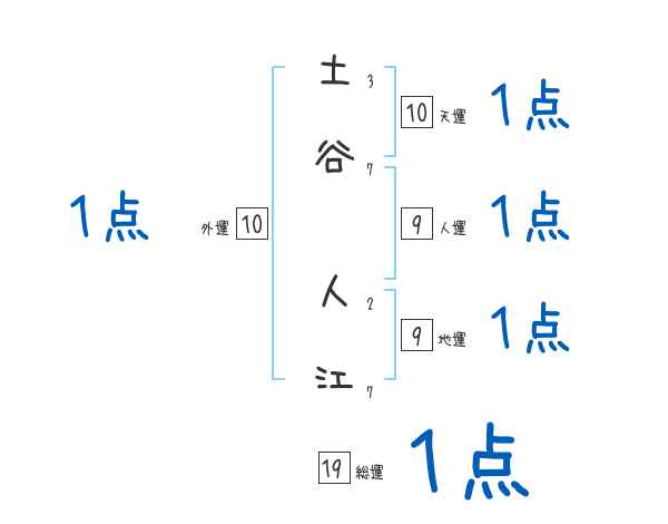 天運![]() | 土谷人江さんの天運は10画の1つ星!不安を感じやすい傾向。ストレスを抱えないように注意しましょう。 家系が持つ宿命的な運勢を表します。祖先から受け継いだ苗字ですので自分の力が及びません。家柄を象徴します。 |