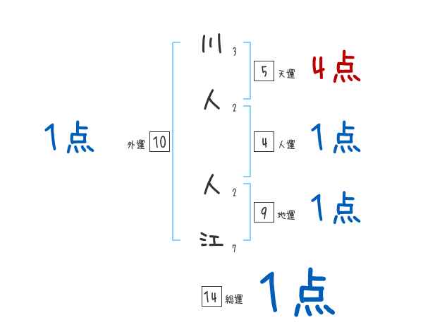 人運![]() | 川人人江さんの人運は4画の1つ星!感情が不安定で苦労するかも。周囲との協調を心掛けましょう。 性格や才能などを表す2番目に重要な運勢です。人間関係や協調性、社会的な成功に影響します。主に20歳から50歳ぐらいまでの中年期の運勢を表します。 |