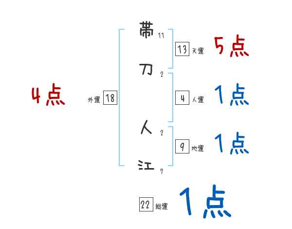 外運![]() | 帯刀人江さんの外運は18画の4つ星!情熱的で剛気。忍耐力があり信頼される。 生活面を象徴する運勢です。外部から受ける影響力を表し、結婚運、家庭運や職場、環境への順応性を表します。 |