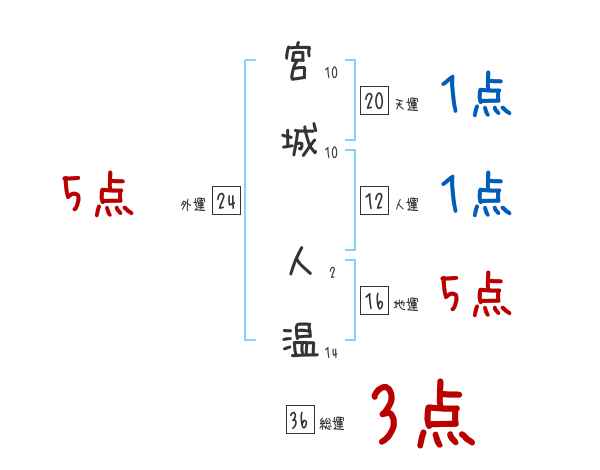 外運![]() | 宮城人温さんの外運は24画の5つ星!家庭運が良く順調な人生。金運にも恵まれる。 生活面を象徴する運勢です。外部から受ける影響力を表し、結婚運、家庭運や職場、環境への順応性を表します。 |