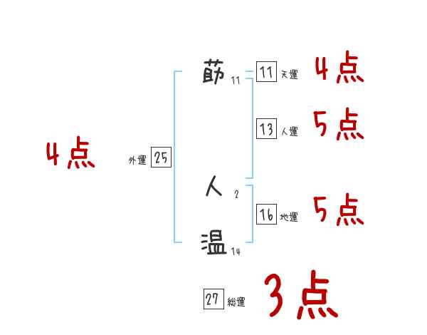 天運![]() | 莇人温さんの天運は11画の4つ星!着実に富や地位を得る幸運な人生。 家系が持つ宿命的な運勢を表します。祖先から受け継いだ苗字ですので自分の力が及びません。家柄を象徴します。 |