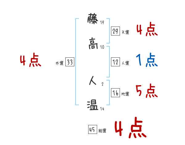 総運![]() | 藤高人温さんの総運は45画の4つ星!もくもくと物事を進め達成する。地味な努力家。 あなたの人生を表す1番重要な運勢です。生涯を通じて影響する総合運となり、主に50歳以降の晩年期に影響を及ぼします。 |