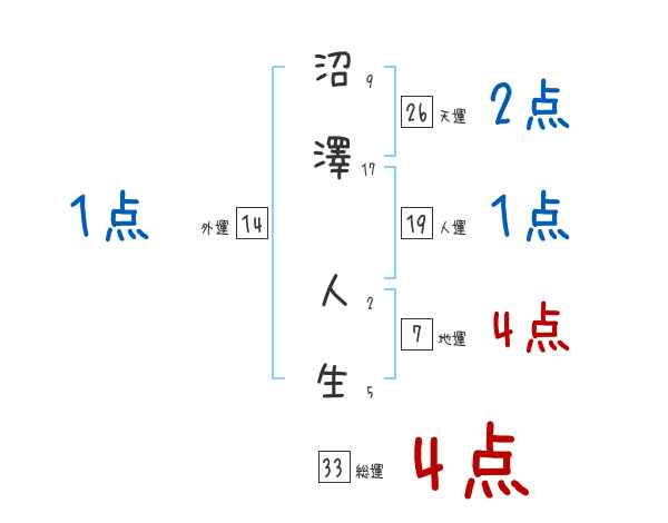 天運![]() | 沼澤人生さんの天運は26画の2つ星!波瀾万丈かも。信頼できる人を大事にしましょう。 家系が持つ宿命的な運勢を表します。祖先から受け継いだ苗字ですので自分の力が及びません。家柄を象徴します。 |