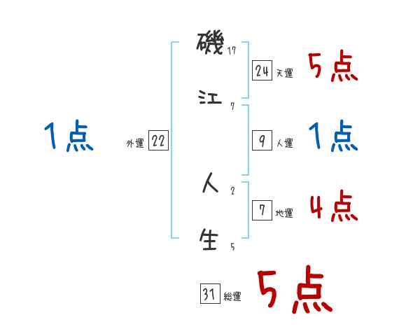 外運![]() | 磯江人生さんの外運は22画の1つ星!努力することが苦手ないっぽう手先が器用。芸術性にも優れる。 生活面を象徴する運勢です。外部から受ける影響力を表し、結婚運、家庭運や職場、環境への順応性を表します。 |