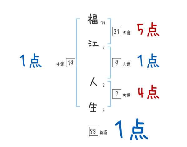 総運![]() | 福江人生さんの総運は28画の1つ星!家庭環境に注意。スポーツで活躍できる能力があるかも。 あなたの人生を表す1番重要な運勢です。生涯を通じて影響する総合運となり、主に50歳以降の晩年期に影響を及ぼします。 |
