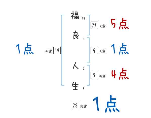 総運![]() | 福良人生さんの総運は28画の1つ星!家庭環境に注意。スポーツで活躍できる能力があるかも。 あなたの人生を表す1番重要な運勢です。生涯を通じて影響する総合運となり、主に50歳以降の晩年期に影響を及ぼします。 |