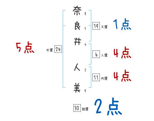 外運![]() | 奈良井人美さんの外運は24画の5つ星!家庭運が良く順調な人生。金運にも恵まれる。 生活面を象徴する運勢です。外部から受ける影響力を表し、結婚運、家庭運や職場、環境への順応性を表します。 |