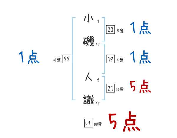 外運![]() | 小磯人識さんの外運は22画の1つ星!努力することが苦手ないっぽう手先が器用。芸術性にも優れる。 生活面を象徴する運勢です。外部から受ける影響力を表し、結婚運、家庭運や職場、環境への順応性を表します。 |