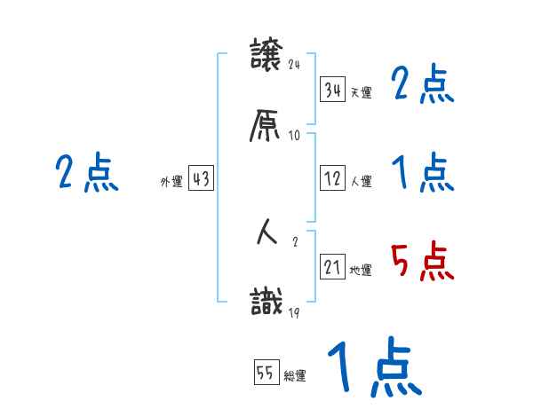 天運![]() | 譲原人識さんの天運は34画の2つ星!独創性に優れるが、自尊心が強く災難に注意しましょう。 家系が持つ宿命的な運勢を表します。祖先から受け継いだ苗字ですので自分の力が及びません。家柄を象徴します。 |