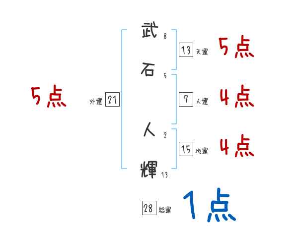 天運![]() | 武石人輝さんの天運は13画の5つ星!才能に恵まれ人気がある。名声を手に入れる。円満な人生。 家系が持つ宿命的な運勢を表します。祖先から受け継いだ苗字ですので自分の力が及びません。家柄を象徴します。 |